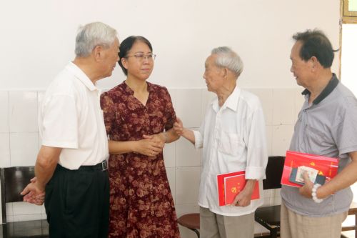 党委书记张海霞(左二)认真听取老同志们的意见和建议