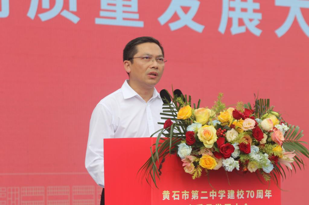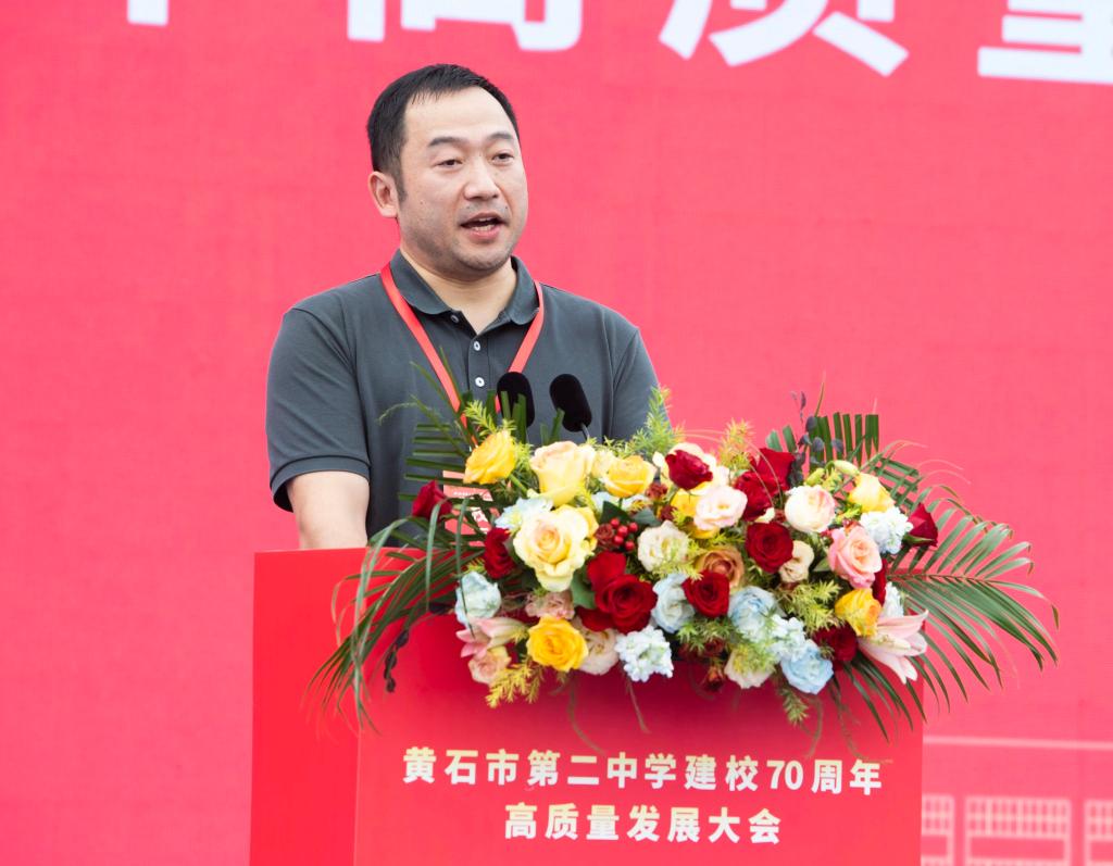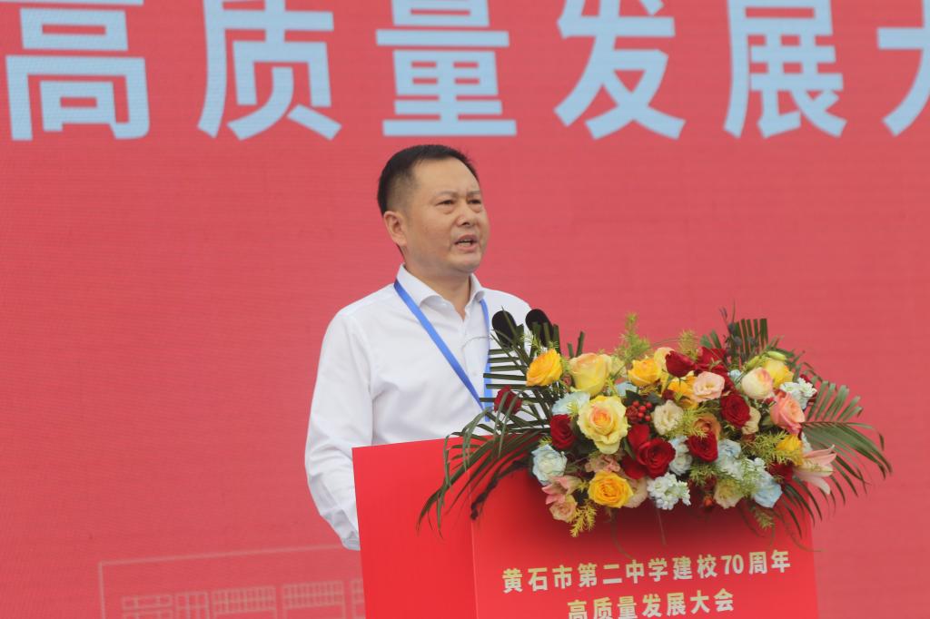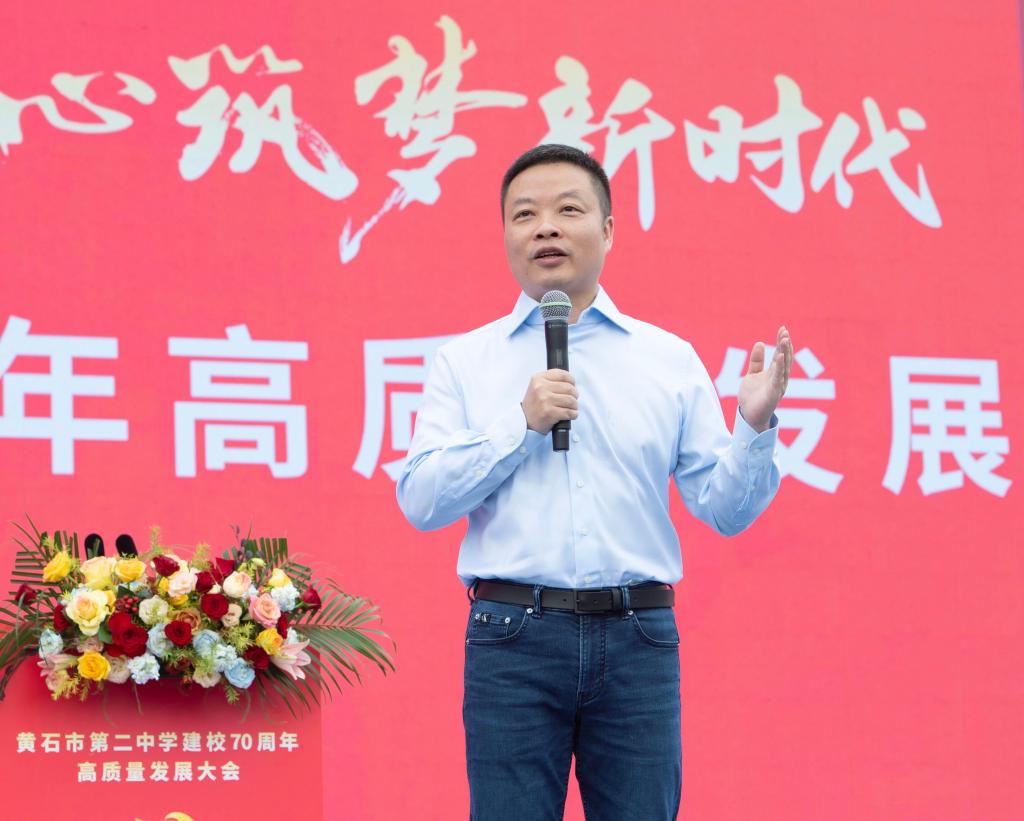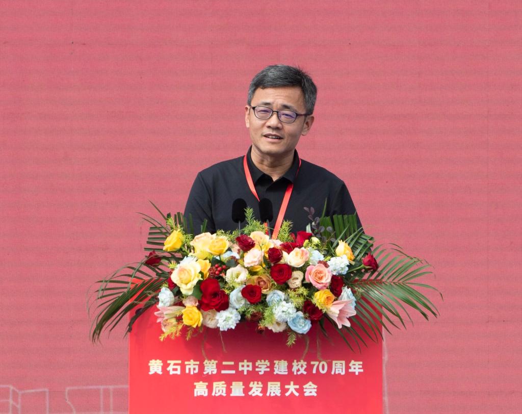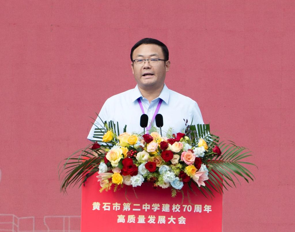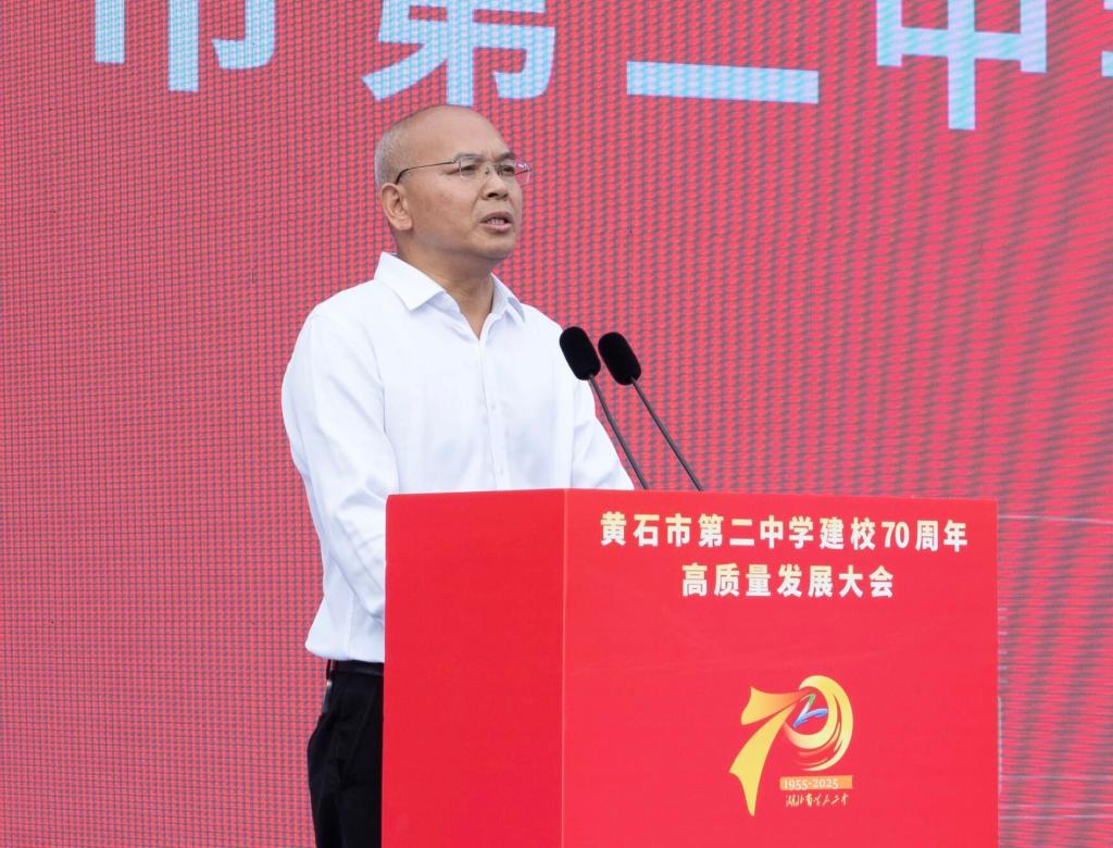 市委副书记、市委教育工委书记郝胜勇代表市委、市政府向黄石二中全体师生和广大校友表示祝贺,向长期以来关心支持黄石教育事业发展的社会各界人士表示感谢。郝胜勇指出,黄石二中自1955年建校以来,始终秉承“立德树人、为国育才”的办学宗旨,培养了大批德才兼备、贡献突出的优秀人才,高考成绩连年跃升,学科竞赛屡创佳绩,已成为黄石基础教育的一面旗帜,为全市经济社会发展作出重要贡献。郝胜勇表示,市委、市政府将始终坚持教育优先发展战略,持续支持黄石二中发展,加大教育投入,优化资源配置,为学校营造良好发展环境。希望黄石二中肩负起全市基础教育“龙头”使命,坚守“立德树人”根本任务,将思想政治教育贯穿全过程,引导学生成长为有理想、敢担当、能吃苦、肯奋斗的新时代青年。要通过强师资、活课堂、树品牌,深化教联体改革,加强与名校合作,努力建设荆楚一流、全国知名的示范高中。要秉持开放之志,深度融入黄石加快建成武汉都市圈重要增长极的发展大局,健全家校社协同机制,深化教学改革,加强对外交流,以自身高质量发展带动区域教育水平整体提升,努力办好人民满意教育,为黄石持续奋进全省第一方阵、服务全省发展大局作出新的更大贡献。