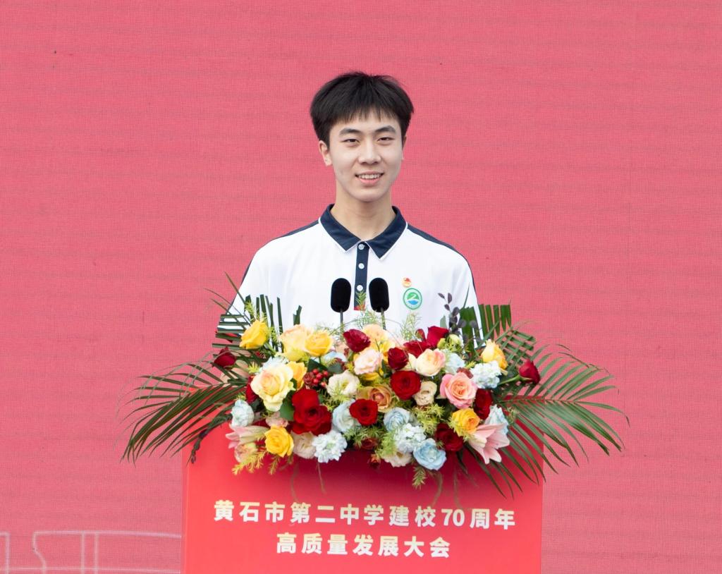 “厚山铸魂,安流引航,我们既是二中辉煌的见证者,更是续写荣光的接力者!”全国新时代好少年、黄石二中高二(3)班学生陈秋实作为学生代表发言,言语间满是青春朝气。他提及自己在二中参与科技创新社团、担任志愿者的经历,深刻体会到“办好负责任的教育”的校训内涵。陈秋实承诺,将以优秀校友为榜样,把“团结、严谨、勤奋、创新”的精神内化于心,努力成长为有家国情怀、有创新能力、有责任担当的新时代青年,让青春在为母校、为祖国的奋斗中绽放光彩。