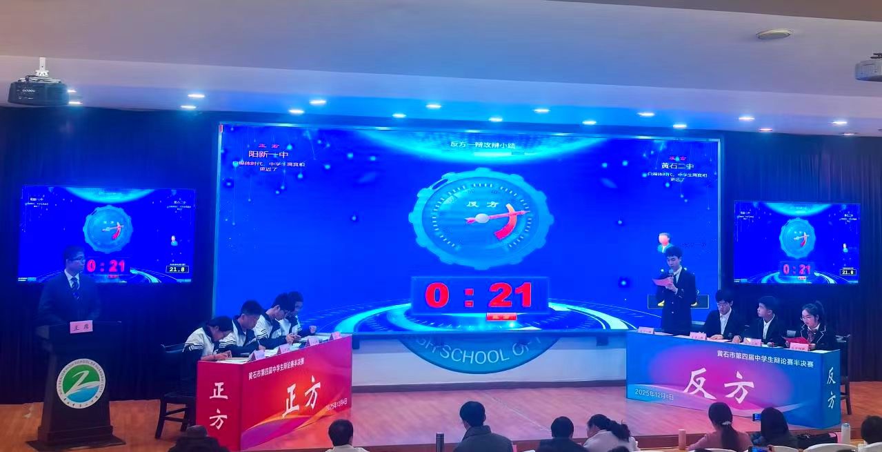 高中组赛场更是高潮迭起,黄石二中、黄石三中、有色一中、阳新一中四支劲旅围绕 “自媒体时代,中学生离真相更近还是更远了” 这一时代热点辩题展开深度博弈。我校203班陈秋实、201班黄庆、116班黄泽轶、212班蔡钟彦姝四位辩手持“自媒体时代,中学生离真相更远了”这一观点在立论、质询、自由辩与总结陈词各个环节中,展现出清晰的逻辑、扎实的学识与出色的临场应变能力,最终凭借更胜一筹的整体发挥,成功锁定决赛席位。与此同时,黄石三中也凭借强劲的实力从高中组脱颖而出,将与我校在决赛舞台上展开终极对决,共同角逐冠军荣誉。