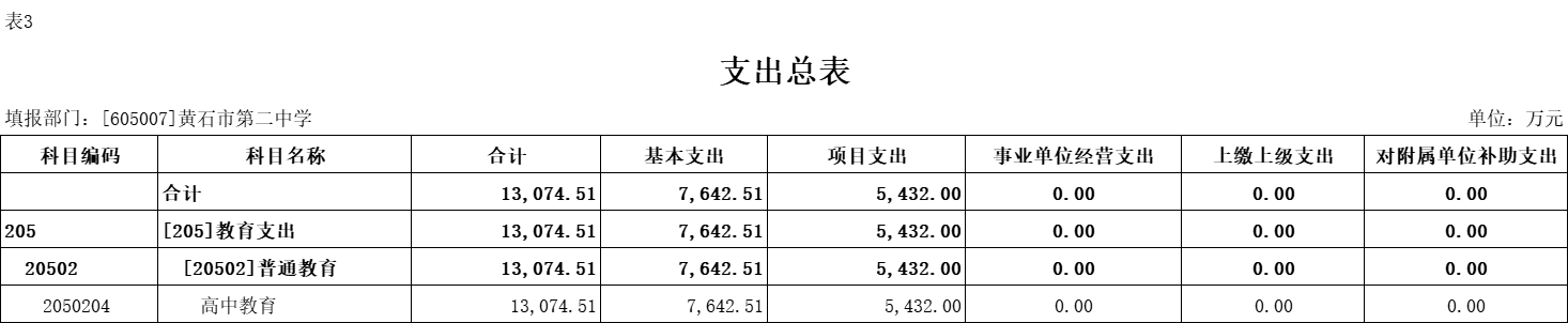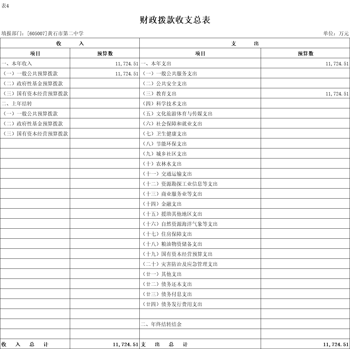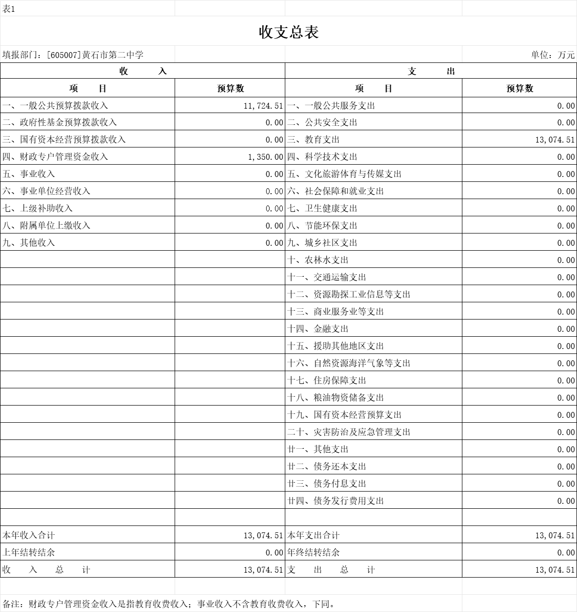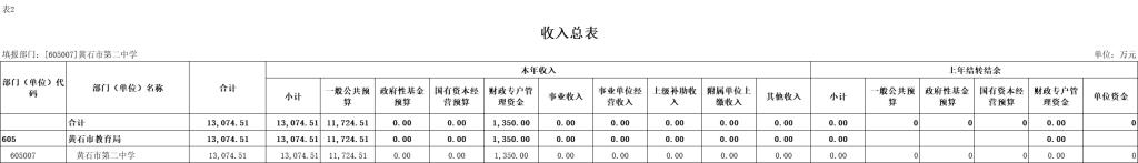 按照综合预算的原则,黄石市第二中学所有收入和支出均纳入部门预算管理。收入包括:一般公共预算拨款收入、财政专户管理资金收入;支出包括:教育支出;2026年度收支总预算 13074.51 万元。