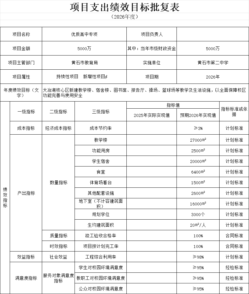 3、优质高中专项项目:预算经费5000万元,为2026年新增项目。主要用于黄石二中新校区建设。