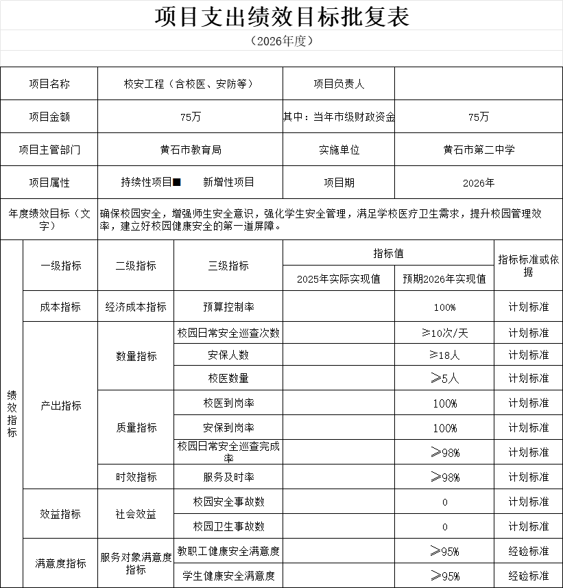 (7)2026年度项目绩效总目标是:保障校园安全巡查到位、安保及校医人员配置充足,校园安全事故数和卫生事故数均为 0,教职工及学生健康安全满意度≥95%。