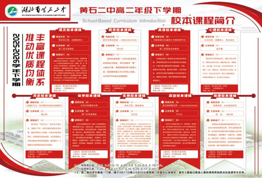 为落实立德树人根本任务,丰富校园学习生活,满足学生多元发展需求,我校高二年级每周五下午校本课程正式开课。本次校本课程精心开设语文、数学、外语、化学、生物、心理、政治、历史、地理九大科目,兼顾文理学科拓展与心理健康指导,为高中学习注入新活力。